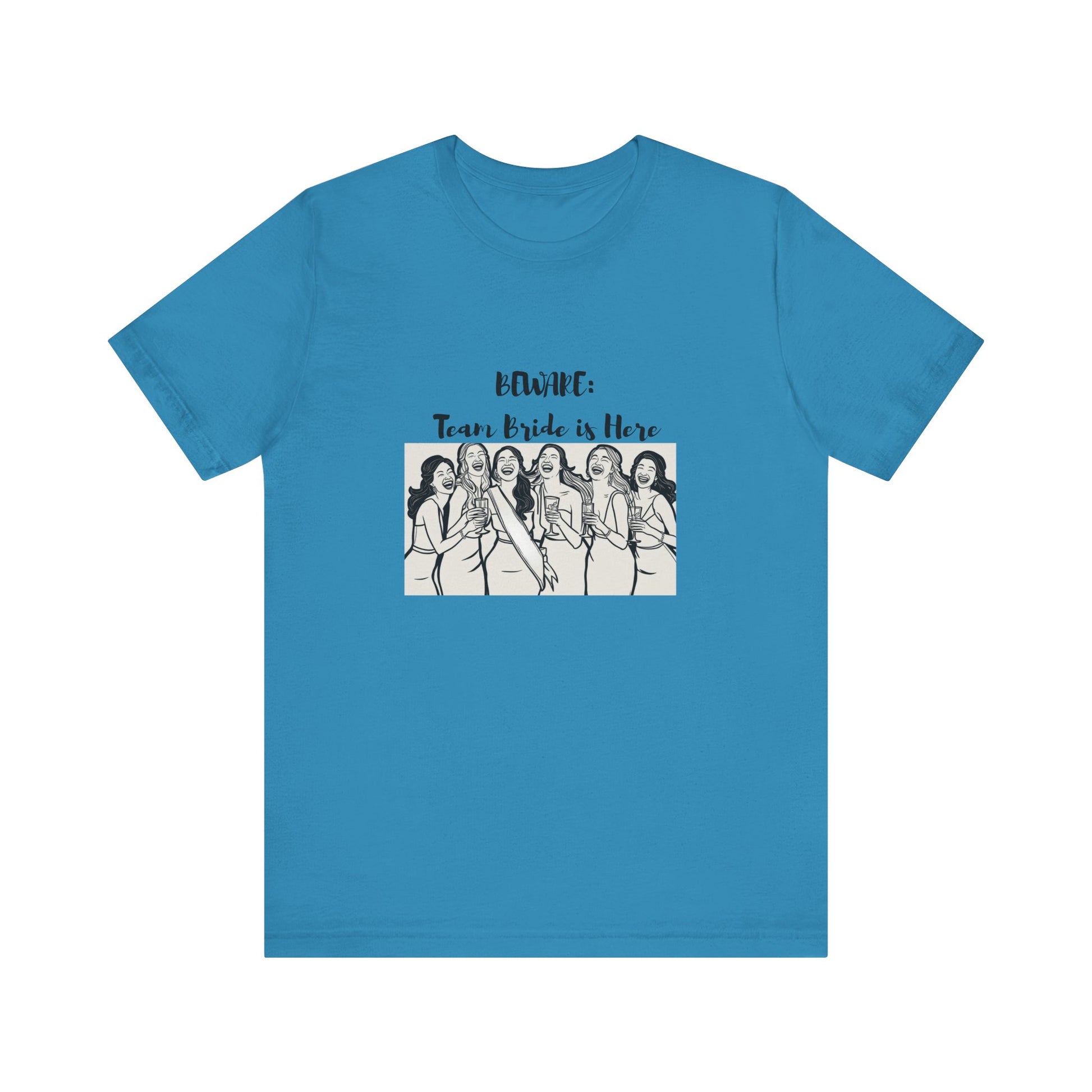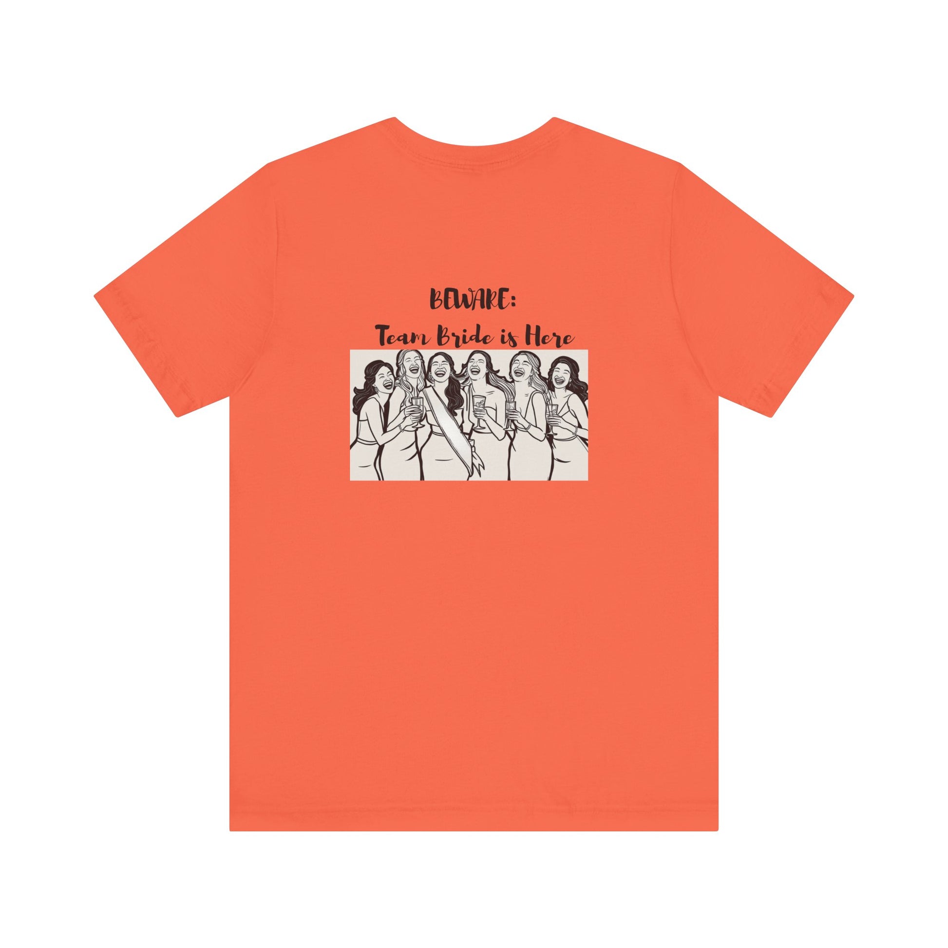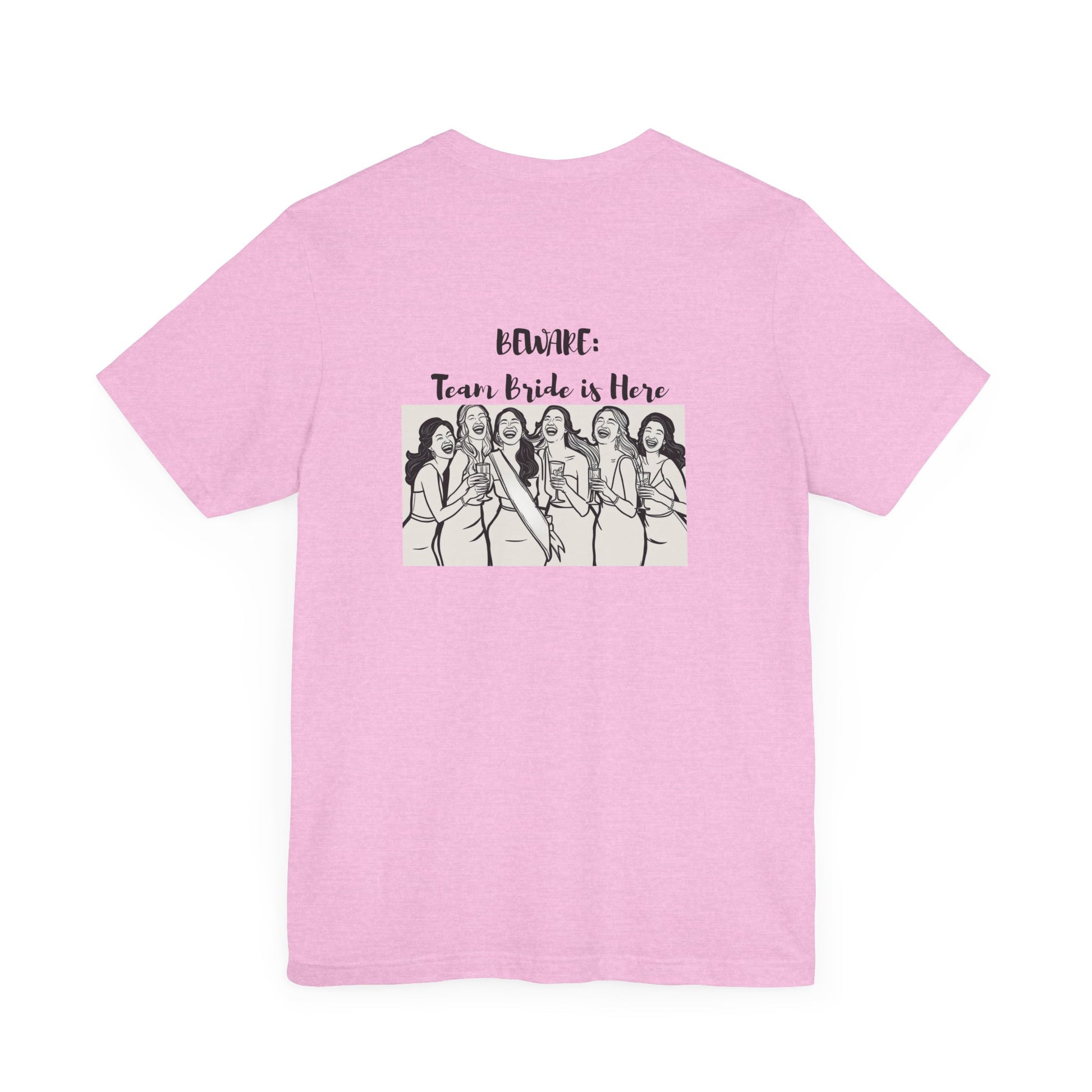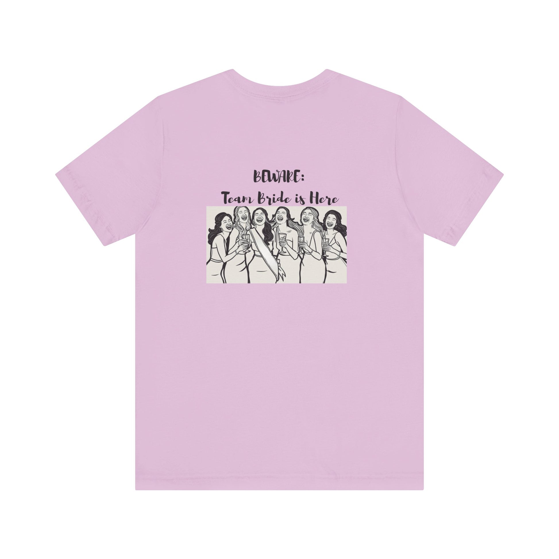 This tee features a bold 'Beware Team Bride' design, perfect for bachelorette parties and bridal events. Made with 100% Airlume combed and ring-spun cotton, this lightweight tee is ideal for active and leisure wear. The retail fit and crew neckline make it versatile for casual and semi-formal settings, a must-have for any bride tribe.