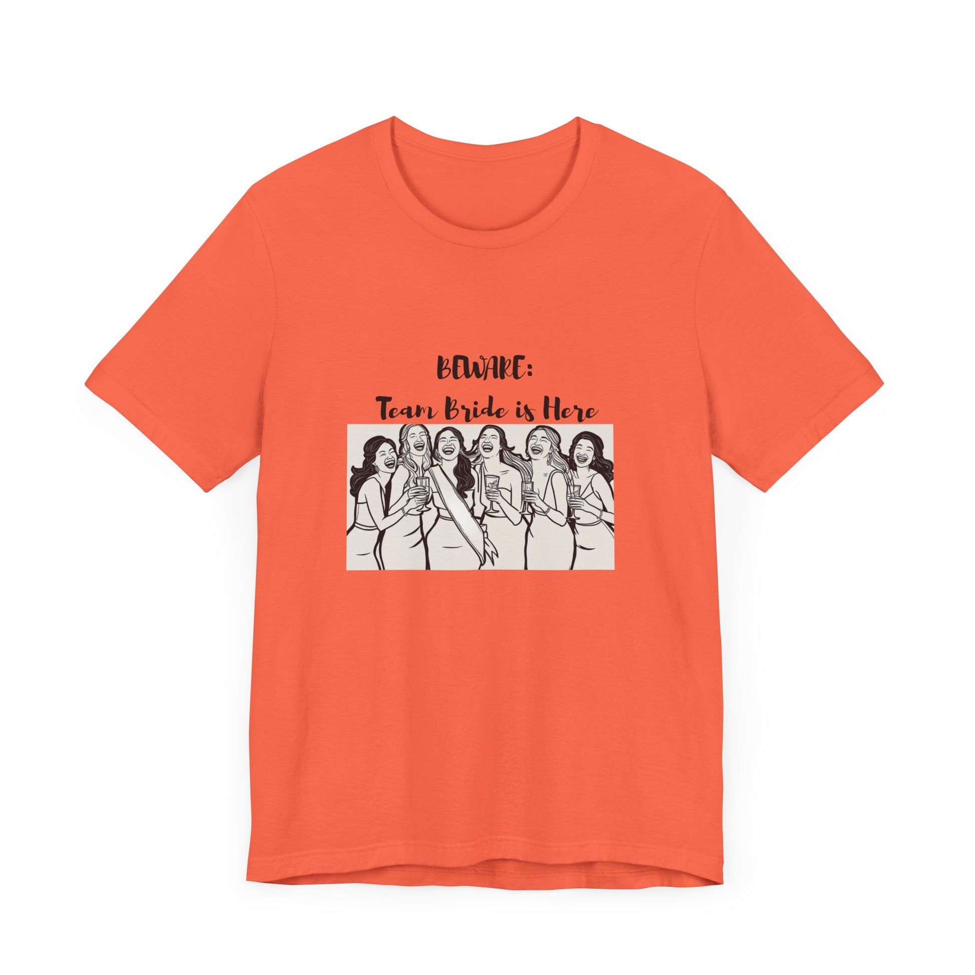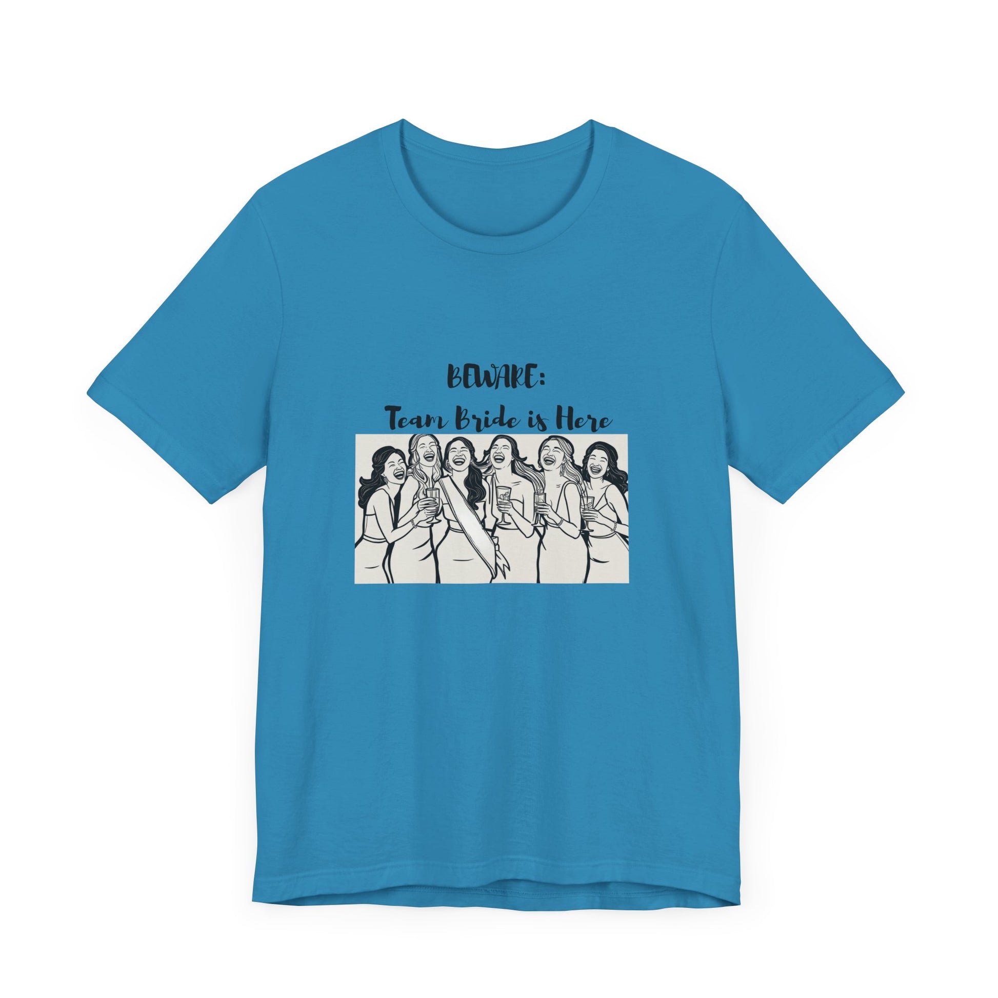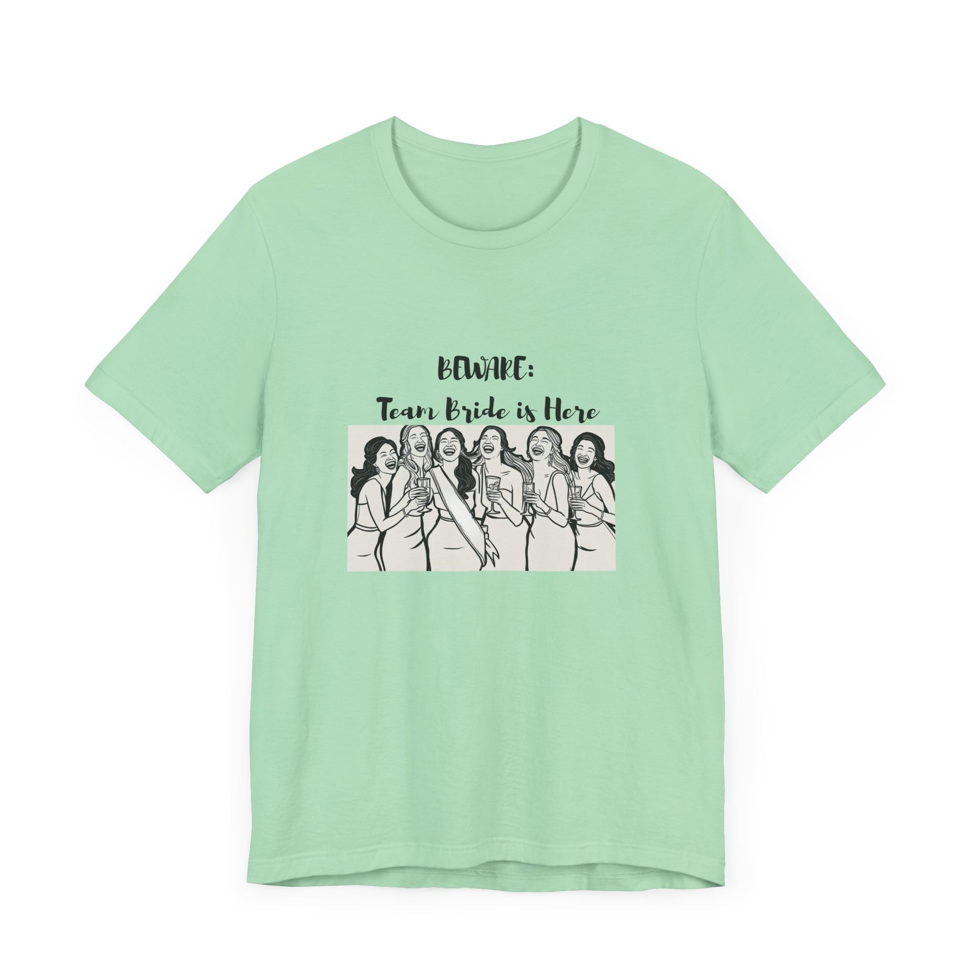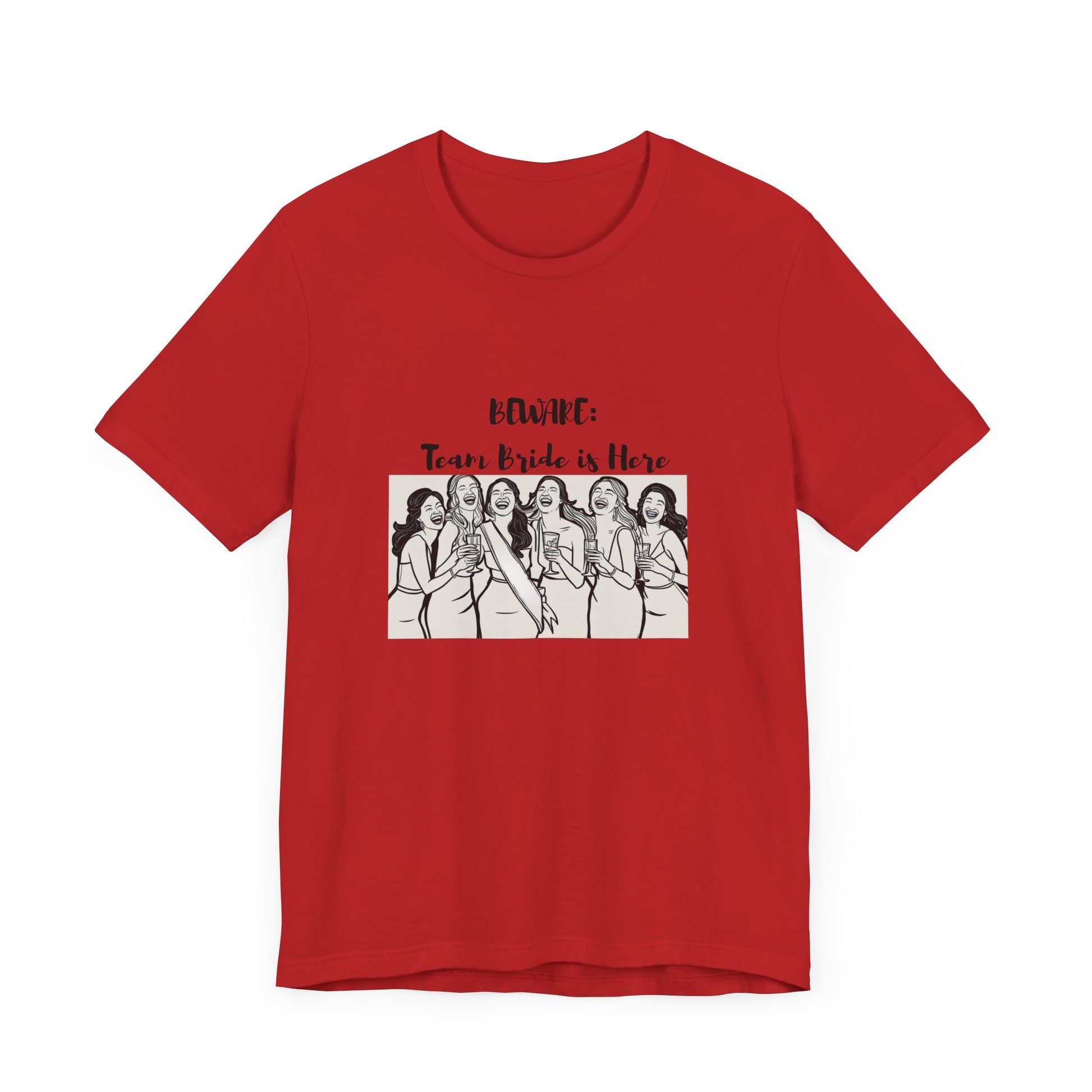 This tee features a bold 'Beware Team Bride' design, perfect for bachelorette parties and bridal events. Made with 100% Airlume combed and ring-spun cotton, this lightweight tee is ideal for active and leisure wear. The retail fit and crew neckline make it versatile for casual and semi-formal settings, a must-have for any bride tribe.