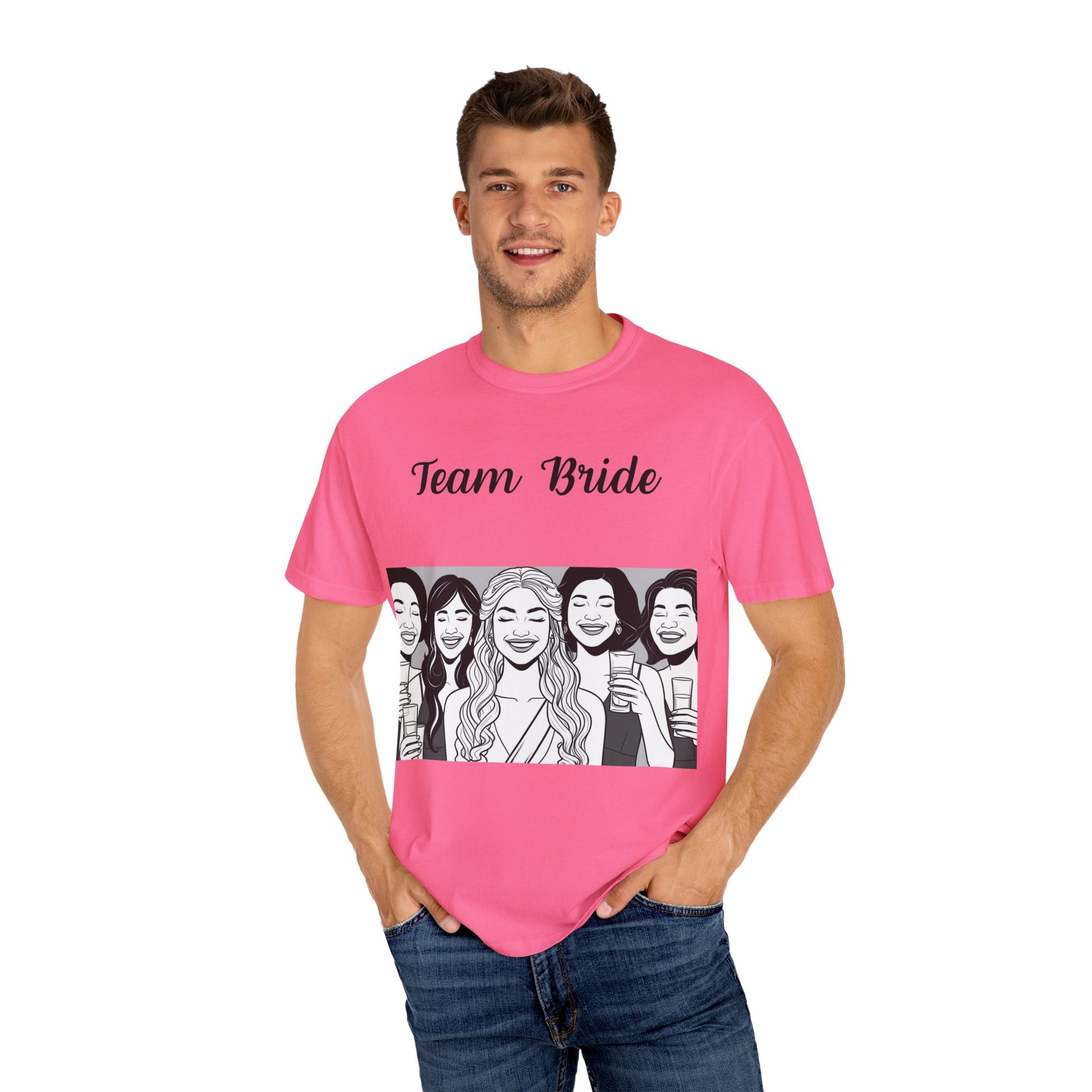 This Team Bride T-shirt exudes a fun and celebratory vibe, making it perfect for bachelorette parties, bridal showers, and other pre-wedding events. The unisex garment-dyed tee offers a relaxed fit for comfortable wear in casual or semi-formal settings, featuring a classic crew neckline for easy accessorizing. Ideal for adults looking to show support for the bride-to-be in style.